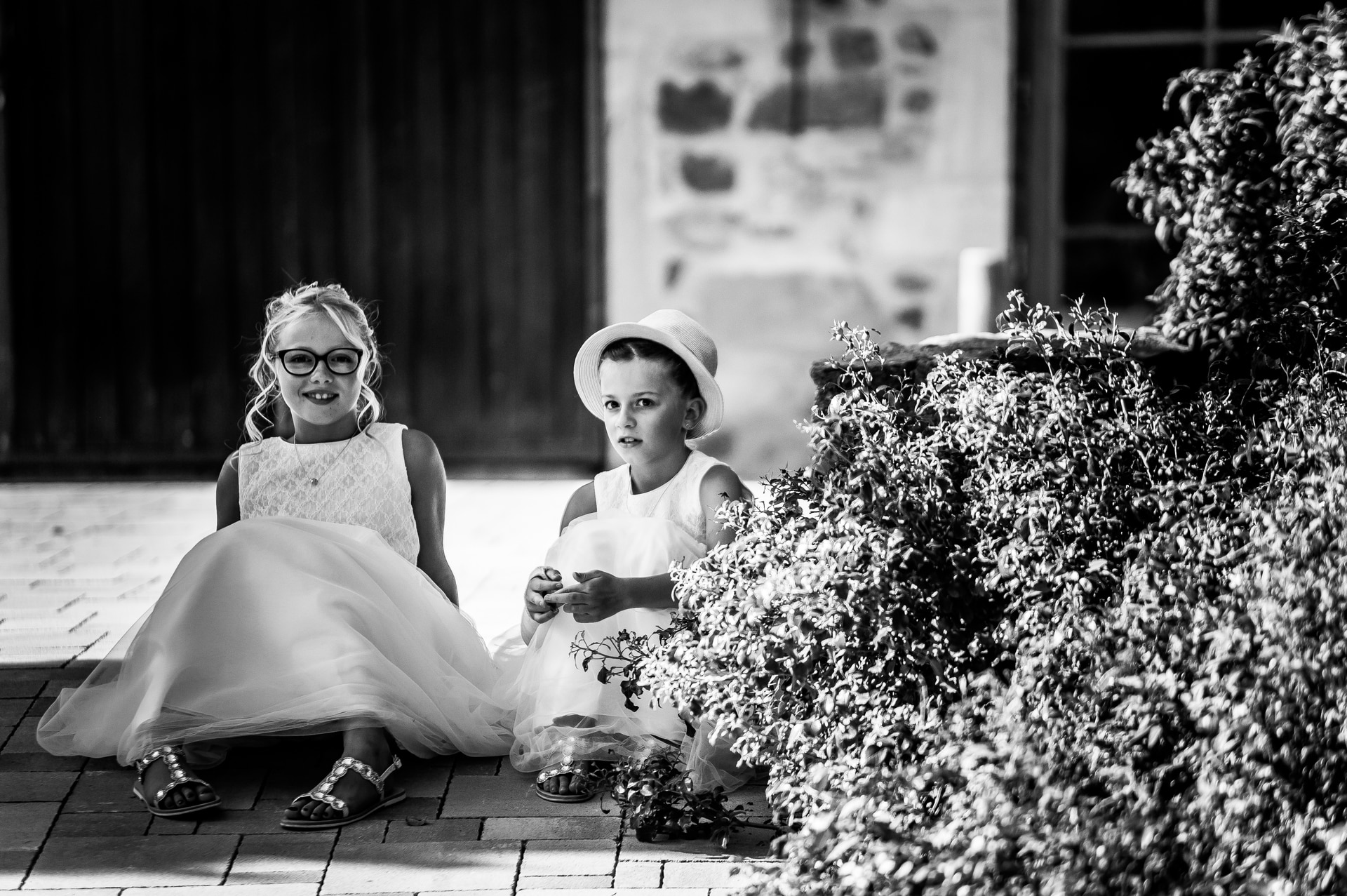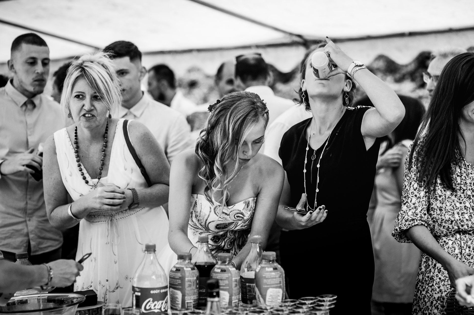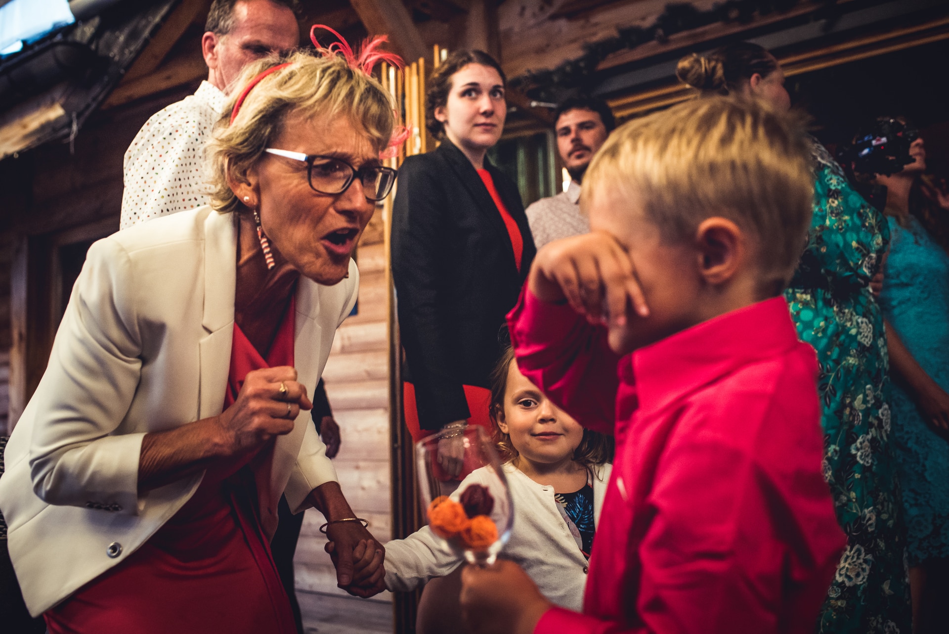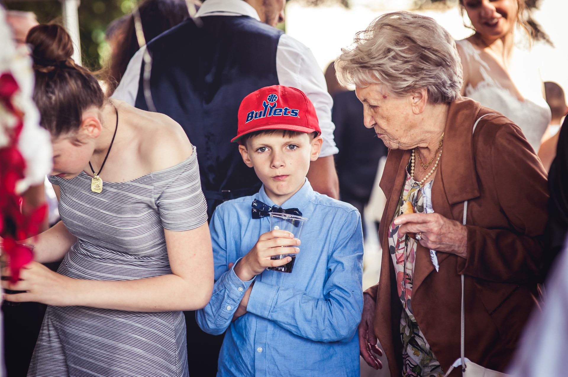 Après toutes ces heures d’attente cérémonieuse, les enfants peuvent enfin se défouler, les adultes se munissent d’un verre et discutent, le moment est effectivement sous le signe de la détente. Le vin d’honneur est propice aux portraits et aux moments insolites volés. Si on fait abstraction des photos de groupes (il faut être réaliste, personne n’aime ça), j’apprécie ce moment car j’ai enfin l’occasion de discuter avec les invités, de trinquer au détour d’un buffet, de me fondre un peu plus dans la masse. De plus la lumière est souvent harmonieuse pour photographier.